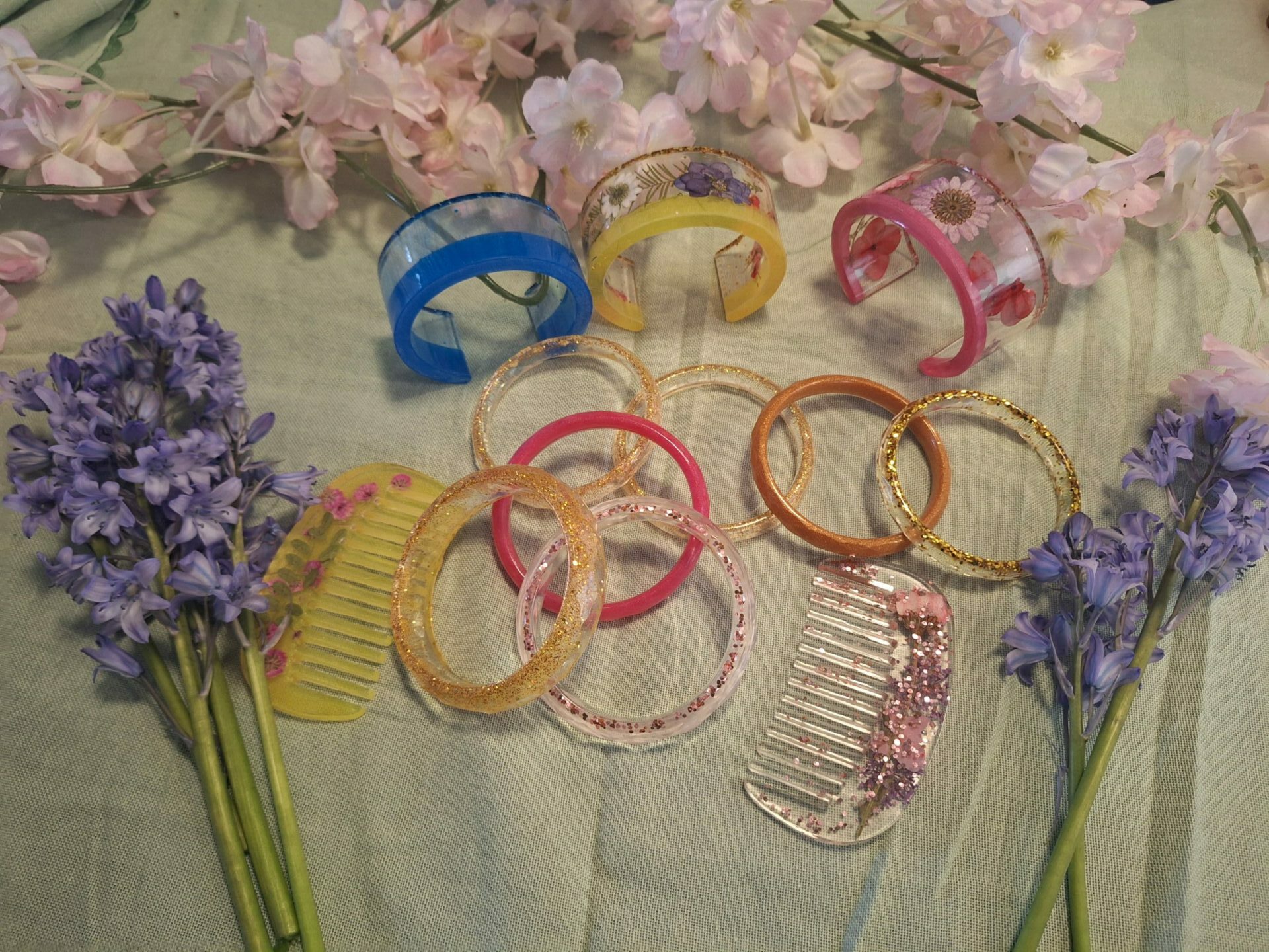 Marque-pages faits main, bracelets, peignes décoratifs et objets pratiques comme porte-savons ou distributeurs de savon.