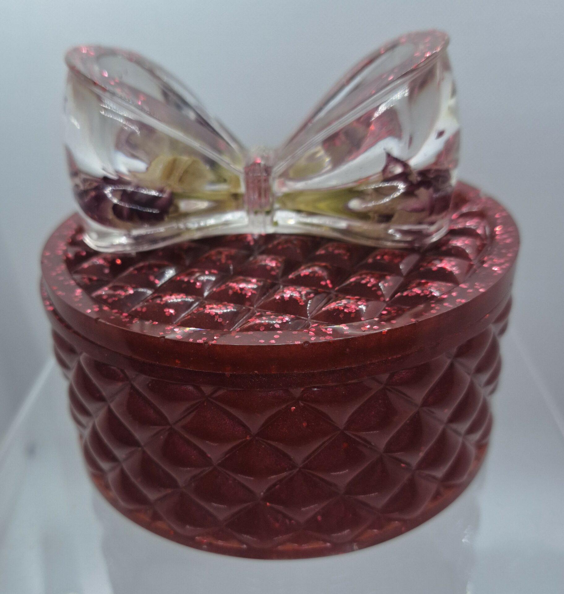 Boîte à bijoux ronde en résine époxy avec véritables fleurs séchées incrustées dans un nœud transparent.